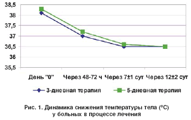 Динамика снижения температуры тела у больных в процессе лечения представлена на рисунке 1. К моменту завершения исследования (через 12±2 сут от начала терапии) температура тела снизилась до 36,5±0,1