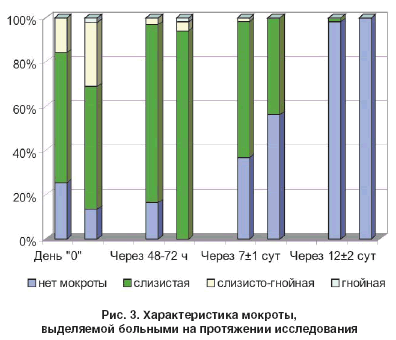 За время лечения изменялась и качественная характеристика мокроты. Уже через 48-72 ч от начала терапии среди обследованных резко сократилась доля пациентов со слизисто-гнойной и гнойной мокротой, а через 7±1 сут их практически не осталось.