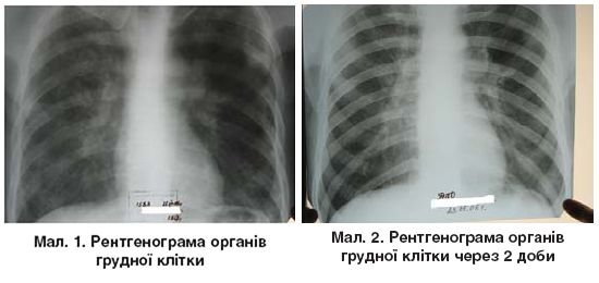 При огляді хворого відзначалися мармуровий колір шкіри, відсутність висипів. Пульсація на судинах кінцівок збережена: пульс – 120/хв задовільних характеристик. Тони серця ослаблені. Над легенями вислуховувалися середньопухирцеві хрипи в міжлопаткових ділянках і в нижніх відділах легень. Печінка, селезінка не збільшені. Значний біль при пальпації по ходу судин лівої ноги. В крові Ер. – 3,3 х 1012, Нв – 108 г/л, L – 10,0-109, еозинофілів – 30%, ШОЕ – 50 мм/год. Рентгенологічно – в легенях із обох сторін вогнища інфільтрації (мал. 1-2). Хворому встановлено діагноз: двобічна не госпітальна вогнищева пневмонія, ІІІ група, тяжкий перебіг на фоні хронічного обструктивного захворювання легень, бронхіальної астми. Дихальна недостатність (ДН) ІІ-ІІІ ступенів. Системний васкуліт, синдром Чарга-Стросса.