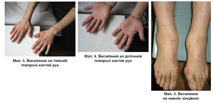 Після перенесеної гострої респіраторної інфекції хворий повторно поступив у терапевтичне відділення в тяжкому стані зі скаргами на припухлість кистей рук, гомілково-ступневих, ліктьових суглобів, біль у суглобах, тверді вузликові висипання рожевого кольору, місцями бульозні, геморагічні, виразкові (мал. 3-5), біль у попереку, м’язах нижніх кінцівок, високу температуру тіла (39 °С), загальну слабкість.