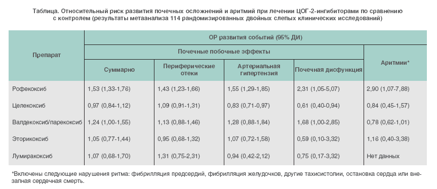 Таким образом, результаты этого метаанализа свидетельствуют о наличии существенных различий в отношении почечной безопасности между разными представителями специфических ингибиторов ЦОГ-2. При решении вопроса о выборе препарата этого класса для лечения пациентов с повышенным риском развития осложнений со стороны почек (артериальной гипертензии, почечной недостаточности) предпочтение следует отдавать целекоксибу.