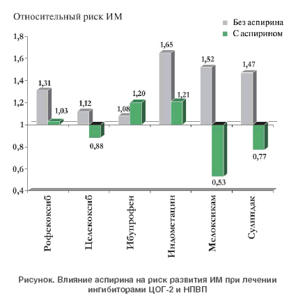 До последнего времени не было в достаточной мере аргументированного ответа на вопрос, действительно ли добавление аспирина к неселективным НПВП и коксибам предупреждает развитие сердечно-сосудистых событий. Информация по этому поводу была представлена на конгрессе EULAR в 2006 г. в докладе G. Singh и соавт. [38]. Влияние дополнительного назначения аспирина на риск развития острого ИМ при лечении остеоартроза и ревматоидного артрита ингибиторами ЦОГ-2 и неселективными НПВП было изучено на основании анализа 2 356 885 пациенто-лет из базы данных California Medicaid Database. У этих пациентов было зафиксировано 15 343 случая ИМ, из которых 1233 (8%) – летальных. У больных, которые не принимали аспирин, рофекоксиб повышал риск ИМ на 31%, индометацин – на 65%, мелоксикам – на 52%, сулиндак – на 47%, в то время как целекоксиб и ибупрофен ухудшали кардиоваскулярный прогноз в значительно меньшей степени (12 и 8% соответственно). В тех случаях, когда к рофекоксибу, целекоксибу, мелоксикаму и сулиндаку добавляли аспирин, регистрировалось практически полное нивелирование повышения риска ИМ под влиянием данных препаратов (рисунок). При добавлении аспирина к индометацину этого не происходило, хотя риск ИМ несколько снижался, а при использовании комбинации аспирин + ибупрофен риск развития ИМ не только не снижался, а даже возрастал. Сделан вывод о том, что полная обратимость повышения кардиоваскулярного риска на фоне применения коксибов и некоторых неселективных НПВП под влиянием сопутствующей терапии аспирином может свидетельствовать о роли ингибиции синтеза простациклина этими препаратами. Отсутствие такой обратимости для ибупрофена и индометацина может отражать особенности их фармакодинамического взаимодействия с аспирином при связывании с тромбоцитарной ЦОГ-1. Действительно, доказано, что ибупрофен конкурирует с аспирином за место связывания в молекуле ЦОГ-1 и в случае применения ибупрофена до аспирина антитромбоцитарное действие последнего практически полностью нивелируется [3]. В одном из клинических исследований [24] также продемонстрировано, что у пациентов с СС заболеваниями, получающих аспирин вместе с ибупрофеном, риск смерти от СС причин значительно выше (на 73%), чем у больных, применяющих только аспирин в низких дозах. Следовательно, у лиц, нуждающихся в приеме аспирина, следует избегать назначения ибупрофена и, вероятно, индометацина.