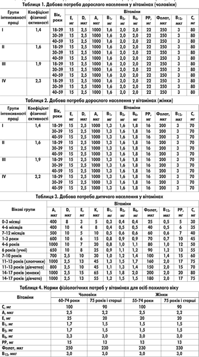 Національні норми фізіологічних потреб населення України у вітамінах складають з урахуванням віку, статі, трудової діяльності, нутрієнтного складу і енергетичної цінності раціонів харчування (табл.1-4).