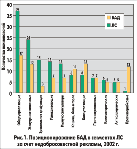 Так все-таки становятся ли БАД на пути ГЛС, или это необходимые для здоровья товары, находящиеся в другой, параллельной плоскости? Теоретически, да — БАД и лекарства должны быть союзниками, но на практике зачастую БАД позиционируется как лечебное средство от конкретного заболевания. Вот тогда мы и начинаем считать их конкурентами ГЛС. В частности, это осуществляется путем недобросовестной рекламы. Как видно из приведенной диаграммы (рис. 1), больше всего недобросовестной рекламы различных БАД в 2002 г. наблюдалось в следующих сегментах: