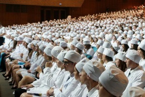 Еще продолжается война, хотя до ее победного завершения, в котором никто уже не сомневается, остается немного – чуть более четырех месяцев. В освобожденном Киеве широко проводятся восстановительные работы, в которых участвует все население, в том числе и студенты. Все мы тогда вместе с преподавателями ежедневно после занятий ремонтировали учебные аудитории, помещения общежитий на улицах Героев революции и Петра Могилы, приводили в порядок институтские клиники на бульваре Шевченко, 17. Были организованы специальные строительные студенческие бригады, работой которых, наряду с администрацией, руководили активисты профкома и комсомольского комитета. Постоянно наведывались в институт и представители Наркомата здравоохранения. Помню посещение ремонтируемых общежитий наркомом И.Ф. Кононенко, его заместителем И.П. Алексеенко. Ежедневно с утра и до поздней ночи во всех местах, где проводились строительные работы, можно было видеть неутомимого директора института Л.И. Медведя и его помощников. К тому времени коллектив института насчитывал почти четыре тысячи человек. К нуждам студентов и преподавателей местные власти и правительство республики проявляли особое внимание. С радостью был встречен указ, приуроченный к юбилейным торжествам, о награждении института орденом Трудового Красного Знамени. Для юбилейного заседания коллективу было предоставлено одно из лучших зданий столицы – оперный театр. 25 декабря его зрительный зал был заполнен до отказа студентами, преподавателями, многочисленными гостями. Трудно вообразить себе энтузиазм участников тех декабрьских торжеств, объединявшее всех чувство преданности своей alma mater, гордости за родной институт. Когда был оглашен правительственный Указ о награждении института, участники заседания поднялись со своих мест – и под сводами старейшего столичного театра долго не смолкали аплодисменты. Минутой молчания почтили преподаватели и студенты светлую память своих товарищей, погибших на фронте. На другой день, 26 декабря, в помещении Украинского театра имени Ивана Франко состоялась научная сессия института, в которой участвовало более 500 сотрудников восстановленных кафедр и клиник.