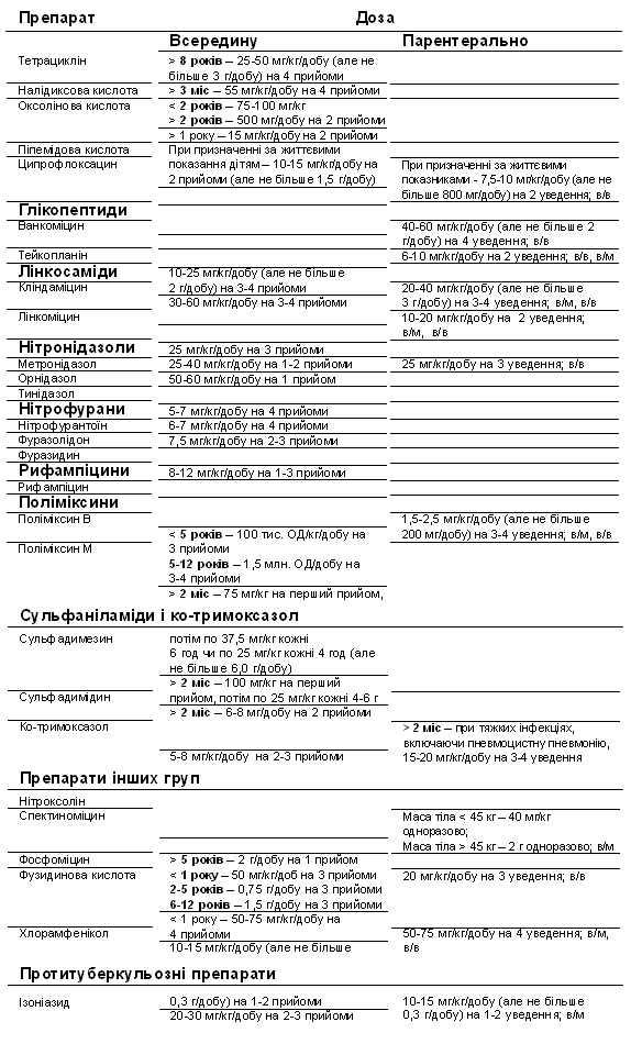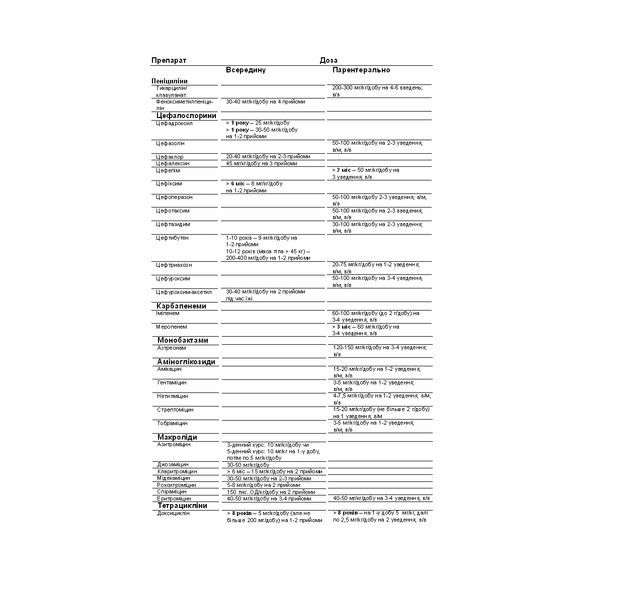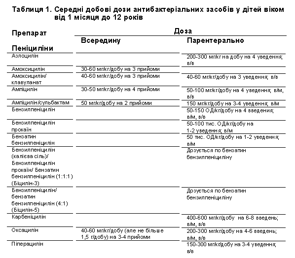 Таблиця 1. Середні добові дози антибактеріальних засобів у дітей віком від 1 місяця до 12 років (частина 1, 2, 3, 4)