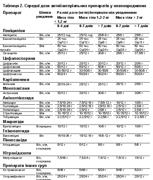 Таблиця 2. Середні дози антибактеріальних препаратів у новонароджених