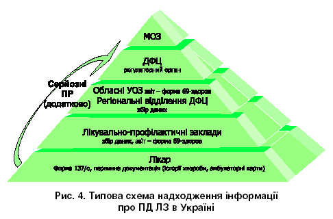 Згідно з чинним законодавством України та відповідними наказами МОЗ, затвердженими міністерством юстиції, у нашій державі було впроваджено організаційну вертикаль контролю за безпекою ЛЗ, головною діючою фігурою в якій є лікар, його компетентність і сумління, та визначено джерела інформації про ПД (рис. 3-4).