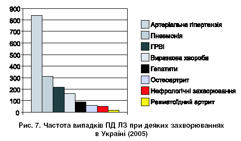 За підтримки органів охорони здоров’я і, насамперед, лікарів, у галузі фармаконагляду вже сформувалася певна група вітчизняних фахівців, зусиллями яких запрацювала ця система в нашій країні. В Україні впроваджено перший рівень фармакологічного нагляду – систему спонтанних повідомлень, яка дозволяє ознайомити читачів із деякими особливостями структури ПД ЛЗ. Основні захворювання, при яких реєструють найбільшу кількість проявів ПД ЛЗ і які певною мірою є показниками стану здоров’я населення України, представлено на рисунку 7.