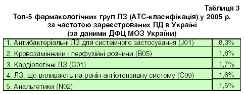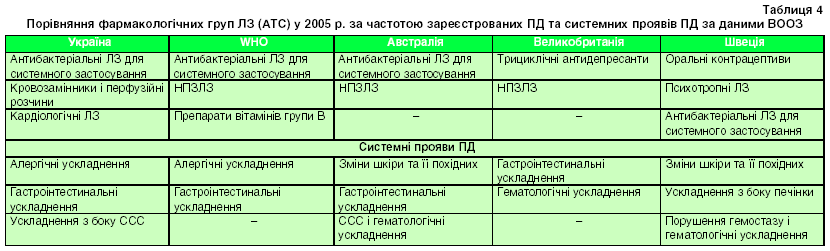 Таким чином, в Україні, на відміну від інших країн, серед (табл. 3) груп ліків, що переважали за кількістю проявів ПД, на першій позиції залишились антибактеріальні ЛЗ для системного застосування. Останнє співпадає з даними ВООЗ (табл. 4).