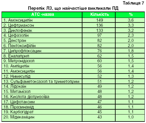 Топ-10 лідерів серед фармакологічних груп препаратів (за АТС-класифікацією, WHO, 1999), які найчастіше спричиняли ПД, представлений у таблиці 8.