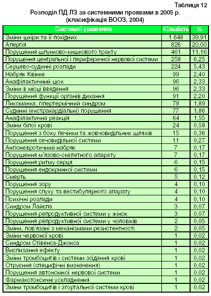 Розподіл ПД ЛЗ за системними проявами представлено у таблиці 12.