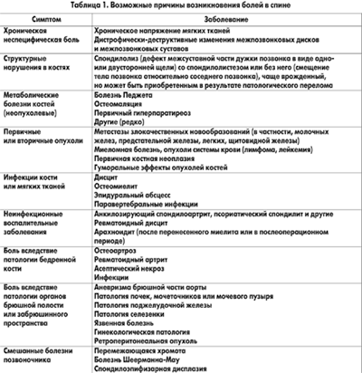 Болезни и синдромы, которые могут быть причиной болей в спине, представлены в таблице 1.