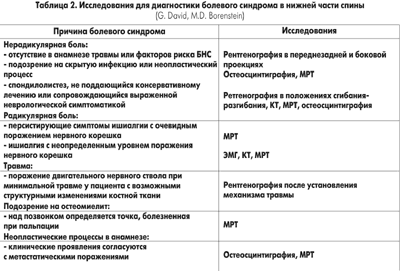 Постановка диагноза при болевом синдроме в нижней части спины требует особого внимания специалиста (табл.2). По мнению M. D. Bratton, последующего диагностического поиска требует наличие таких данных.