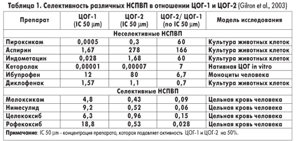 В таблице 1 приведены данные по селективности в отношении ЦОГ основных, наиболее часто использующихся НСПВП.