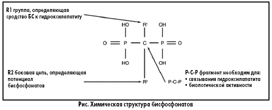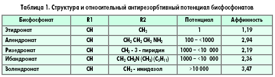 Структура P-C-P предусматривает множество возможных вариантов соединений за счет модификации двух боковых цепей на атоме углерода или этерификации фосфатных групп. Ранние исследования показали, что главным компонентом БС является фрагмент P-C-P, определяющий их сродство к костной ткани. Однако создание химических модификаций в положениях R1 и R2 структуры БС привело к прогрессивному увеличению антирезорбтивного потенциала и изменениям в сродстве БС к костной ткани (рис.; табл. 1). Фрагмент R1 определяет дополнительную аффинность: замена атома водорода гидроксильной группой в положении R1 увеличивает сродство к гидроксилапатиту примерно в два раза. Вместе с тем очевидные различия БС в сродстве к костной ткани предполагают, что фрагмент R1, возможно, не единственный определяющий фактор указанного сродства. Введение компонентов азота (первичного и третичного, или гетероциклического кольца) в положение R2 увеличило антирезорбтивный потенциал БС в три раза по сравнению с БС, не содержащими азот. Однако важным является не только наличие атомов азота, но и их положение в молекуле, так как антирезорбтивный потенциал может отличаться более чем в 700 раз между изомерами одного и того же БС. Кроме того, недавние исследования показывают, что различные группы азота в положении R2 могут вносить свой вклад в сродство к гидроксилапатиту содержащих азот БС.