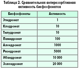 Действие БС на резорбцию кости существенно различается. Существуют и различия в их сравнительной активности с различными системами тестов. В перспективе клинического использования вызывают интерес новые БС с минимальным нежелательным влиянием на минерализацию и выраженным антирезорбтивным действием. В этом аспекте значительную активность без увеличения влияния на минерализацию кости или изменения их сродства к гидроксилапатиту проявляют аминопроизводные. Памидронат приблизительно в 100 раз мощнее этидроната в предотвращении резорбции метафиза у крыс (табл. 2). Алендронат в 10 раз более мощный, чем памидронат. Имеется некоторая зависимость активности БС от длины боковой цепи. Однако увеличение длины боковой цепи за счет более 4 атомов углерода приводит к уменьшению активности БС (неридронат). Расширение антирезорбтивного действия может быть достигнуто с помощью добавления боковых цепей к аминогруппе (ибандронат) или циклической замены, особенно содержащей азот (ризедронат).