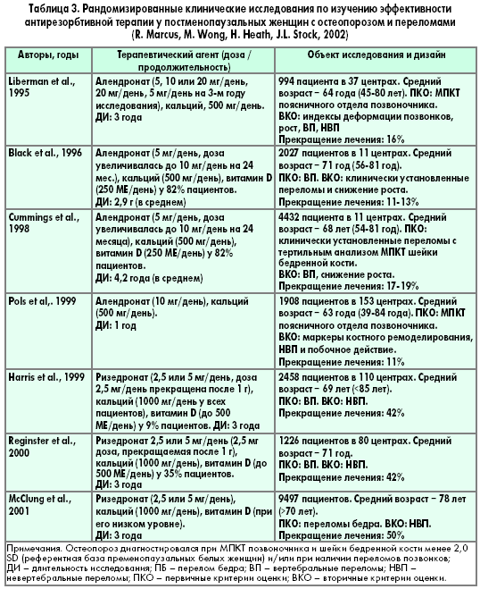 Исследования последних лет показали, что длительное использование БС приводит к уменьшению частоты переломов у пациентов с остеопорозом (табл. 3).
