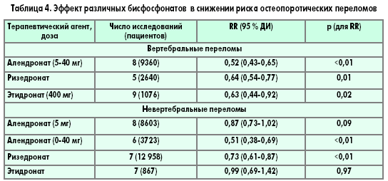 В недавно проведенном метаанализе (A.Cranney, G. Wells, A. Willan et al., 2002) было проведено сравнение эффективности различных БС в снижении риска остеопоротических переломов (табл. 4).