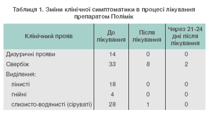У процесі лікування у 58 (96,7%) з 60 хворих відмічено поступове зниження інтенсивності суб'єктивних відчуттів і ступеня вираженості клінічних проявів захворювання. Повне зникнення клінічних симптомів захворювання спостерігалося на 7-10-й дні терапії препаратом Полімік, в ці ж самі строки нормалізувались і основні показники лабораторного тестування виділень зі статевих органів. На 20-21-й день після початку застосування Поліміку дані клініко-лабораторного дослідження у цих пацієнтів були в межах норми.