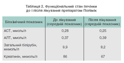 Одним із завдань дослідження було з'ясування впливу лікування препаратом Полімік на функціональний стан печінки у пролікованих пацієнтів. Результати проведених біохімічних досліджень наведені в таблиці 2.