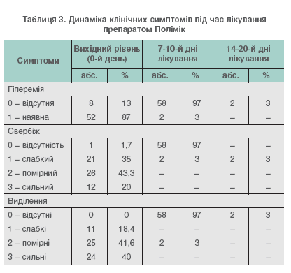 Аналіз цих даних свідчить, що переносимість препарату Полімік виявилася дуже доброю у 42,31% пацієнтів, доброю – у 54,36% і задовільною – у 3,33%. У жодного з хворих не виявлено незадовільної переносимості препарату. Як видно з наведених даних, десятиденний курс лікування препаратом Полімік приводив до значного зменшення вираженості клінічних проявів захворювання.