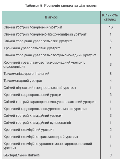 Під наглядом перебували 60 пацієнтів віком від 18 до 60 років, з них 35 (58%) жінок та 25 (42%) чоловіків, з діагнозами: бактеріальний вагіноз – 23 жінки (66%), неспецифічний вульвовагініт – 8 жінок (23%), трихомонадний кольпіт – 4 жінки (11%), бактеріальний уретрит – 18 чоловіків (72%), трихомонадний уретрит – 7 чоловіків (28%).