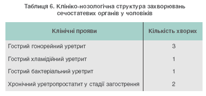 Під наглядом знаходилися 7 чоловіків і 53 жінки віком від 19 до 50 років, у яких діагностовано запальні захворювання урогенітального тракту інфекційного або постінфекційного ґенезу. Клініко-нозологічна структура запальних захворювань сечостатевих органів у чоловіків представлена в таблиці 6.