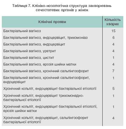 Клініко-нозологічна структура захворювань сечостатевих органів у жінок наведена в таблиці 7.