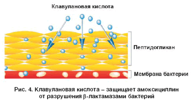 В сочетании с клавулановой кислотой амоксициллин защищен от разрушения β-лактамазами бактерий