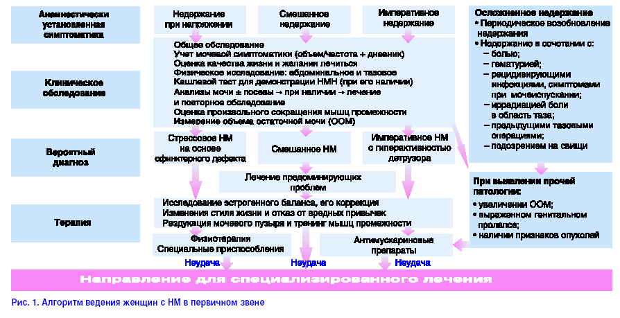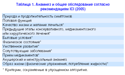 Исходя из реального положения дел в глобальном масштабе, International Continence Society (ICI), являющаяся международным объединением экспертов, в целях модернизации современного понимания проблем НМ в 1998, 2000 и 2004 гг. провела тематические конференции, продолжительные и открытые обсуждения которых завершились утверждением рекомендаций по диагностике и лечению НМ [7, 8]. В первую очередь следует отметить алгоритм ICI для первичного этапа ведения женщин с НМ (рис. 1). Отмечая достоинства документа, следует признать, что алгоритм достаточно сложен как для ВПЗ с ограниченным опытом по ведению НМ, так и для пациенток, неоднозначно относящихся к предписываемым исследованиям и назначениям [4-6].