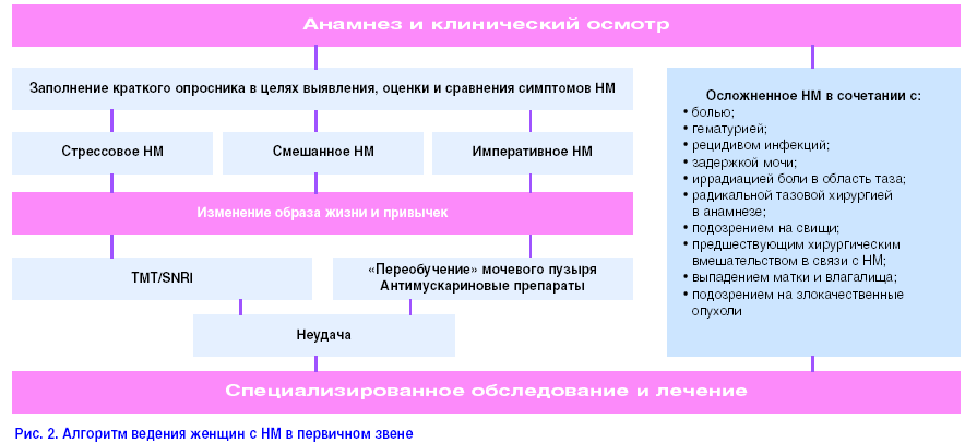 У женщин с ИНМ, а также у пациенток с преобладанием фактора императивности при смешанном НМ методами выбора лечения могут служить «переобучение» мочевого пузыря и/или антихолинергическая мускариновая терапия (рис. 2).