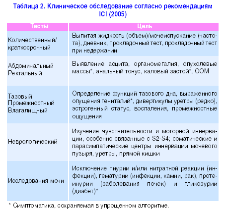 Согласно алгоритму ICI 2005, первичная клиническая оценка включает разнообразные тесты: абдоминальные, ректальные, тазовые, а также исследование мочи (табл. 2). Для количественной оценки НМ обычно используют краткосрочный прокладочный тест, проводимый амбулаторно, либо его долгосрочный вариант – в домашних условиях, хотя относительно воспроизведения и доказательности этих тестов существуют определенные противоречия [23, 24]. Исходя их этого, даже алгоритм ICI рассматривает эти тесты только в качестве дополнительных. Пальпация живота для оценки потенциального наличия асцита или органомегалии уместна лишь у ограниченного числа женщин с НМ. Ректальное исследование может быть полезно в тех случаях, когда предполагается наличие каловых уплотнений, а оценка анального тонуса целесообразна для женщин с сопутствующим недержанием кала.