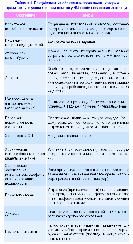 Детальный анамнез и общее обследование следует считать важными составными для оценки и классификации НМ, в то же время информация о начале или продолжительности симптомов – достаточно субъективна и ненадежна (табл. 1) [45]. ВПЗ хорошо известны особенности здоровья пациенток, у них обычно есть информация обо всех амбулаторных обращениях, госпитализациях, проведенных обследованиях, результатах лечения. Главная цель сбора анамнеза и оценки клинической симптоматики состоит в том, чтобы разделить пациенток на тех, кто является кандидатками на успешное начальное лечение, и тех, кому необходимо специализированное наблюдение и лечение (рис. 2). Исходя из этого, ВПЗ должны, в первую очередь, сосредоточиться на обратимых факторах риска, которые косвенно могут повлиять на симптоматику НМ (табл. 3). Обсуждение половой функции не представляется крайне важным на начальном этапе обследования, за исключением тех случаев, когда оно инициируется самой пациенткой. Больных с предыдущими хирургическими вмешательствами (табл. 1), которые могли бы спровоцировать проявления НМ, необходимо сразу направлять для дальнейшего обследования и лечения к соответствующим специалистам (рис. 2).