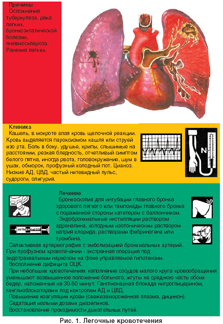 У большинства больных с воспалительными заболеваниями легких резко выражена васкуляризация подслизистого слоя и слизистой оболочки бронхов, при эрозии которых также возникает обильное кровотечение. Этому способствуют активация местного фибринолиза и нарушение гемокоагуляции в результате длительной интоксикации и массивной химиотерапии, особенно при туберкулезе легких на 4-6-м месяце лечения. Только средняя или большая кровопотеря (500 мл и более) приводят к обструктивным нарушениям дыхания, острой гиповолемии и развитию неотложных состояний. Массивной принято считать легочную кровопотерю более 240-600 мл в течение 24-48 часов. В тяжелых случаях профузного кровотечения возможна внезапная смерть, причина которой – развитие асфиксии из-за распространенной обструкции дыхательных путей и сопутствующего бронхоспазма. Величина кровопотери в данном случае играет второстепенную роль. Только массивное внезапное легочное кровотечение при прорыве аневризмы аорты в дыхательные пути, раке легкого и эрозии крупного сосуда могут привести к быстрой асфиксии. Молниеносное легочное кровотечение не сопровождается кашлем.