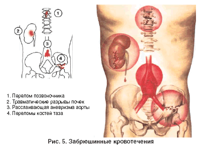 Забрюшинные кровотечения, как правило, являются следствием тяжелых травм или осложнений пункционной биопсии, ангиографии, терапии антикоагулянтами и фибринолитическими средствами (рис. 5).