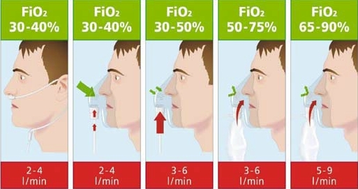 При использовании кислородной маски у пациентов с тяжелой гипоксемией маска должна быть снабжена кислородным мешком‐резервуаром и следует использовать высокую скорость подачи кислорода (до 10–15 л/мин для взрослых) в целях обеспечения его достаточной концентрации во вдыхаемом воздухе.