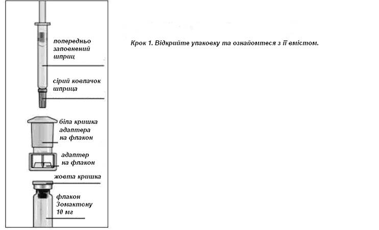 Розчин з концентрацією 10 мг/мл готується шляхом змішування Зомактону з 1 мл розчинника, який знаходиться у попередньо заповненому шприці, як описане нижче.