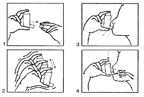 1.Зняти кришку з дозатора (рис. 1). 2. Тримати інгалятор вертикально, як показано на малюнку. 3. Струснути інгалятор протягом 20 секунд (рис.2). 4. Притиснути губи до дозатора (рис.3) і повністю видихнути. 5. Натиснути на аерозольний контейнер як показано на рис.4, одночасно зробивши глибокий вдих ротом. |