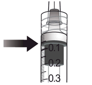 10. Видалити всі пухирці та надлишки розчину препарату, повільно натискаючи на поршень, доки його кінчик не досягне відмітки 0,05 мл на корпусі шприца (рис.12-13).