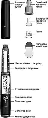 Спочатку перевірте за етикеткою, що в шприц-ручці міститься препарат Райзодег ФлексТач 100 ОД/мл, а потім продивіться ілюстрації, які наведені нижче щоб отримати інформацію щодо різних частин шприц-ручки та голки.