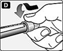 Рис. D. Нагвинтіть голку на шприц-ручку. Повертайте голку доти, доки вона не буде триматись щільно. |