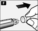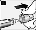 Рис. Е. Зніміть великий зовнішній ковпачок голки. Не викидайте його: він знадобиться після ін’єкції, щоб зняти безпечно голку зі шприц-ручки. |
