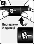 Завжди перевіряйте ток інсуліну перед ін’єкцією. Це допоможе бути певним, що введено повну дозу препарату. Рис. А. Поверніть селектор дози так, щоб виставити 2 одиниці. Переконайтесь, що лічильник дози показує 2. |