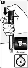 Рис. А.Введіть голку під шкіру. Дотримуйтесь техніки виконання ін’єкції, якої Вас навчили лікар або медсестра. Упевніться, що Ви бачите лічильник дози. Не торкайтеся лічильника дози пальцями: це може зупинити введення інсуліну. Натисніть та утримуйте кнопку дозування, доки лічильник дози повернеться до позначки «0». «0» повинен збігатися з покажчиком дози, і Ви можете почути клацання. Голку слід утримувати під шкірою не менше 6 секунд. Це забезпечує введення повної дози препарату. |