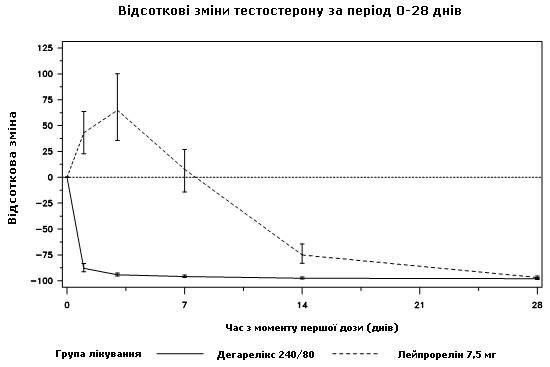 У жодного з пацієнтів, які отримували лікування дегареліксом, не було коливань тестостерону; спостерігалося середнє зниження рівня тестостерону на 94 % на 3-й день. У більшості пацієнтів, які отримували лікування лейпрореліном, було коливання тестостерону; спостерігалося середнє підвищення рівня тестостерону на 65 % на 3-й день. Ця різниця була статистично значущою (p<0,001).
