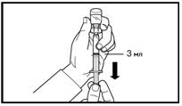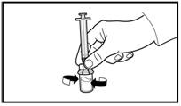 5. Поверніть флакон догори дном та наберіть препарат до лінії позначки в шприц для ін'єкцій. Завжди перевіряйте точність набраного об'єму та відсутність будь-яких повітряних пухирців. |