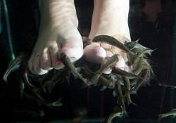 Популярная сеть косметических салонов Соединенного Королевства теперь предлагает экзотическую услугу – рыбок, «мастеров педикюра». Голодные рыбки объедают ороговевшие участки кожи и придают подошвам и пяткам англичанок нежность и мягкость.
