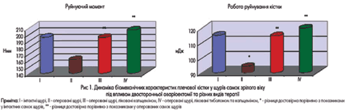 Нами (В. В. Поворознюк, В. І. Лузін, Н. В. Григор’єва, 2001) в експериментальних умовах (модель експериментального остеопорозу у оваріоектомованих самок-щурів зрілого віку) вивчено ефективність тиболону в комбінації з препаратом кальцію третього покоління — кальцеміном. Отримані результати порівнювались з показниками одновікового контролю (без лікування). Виявлено достовірні зміни в біомеханічних характеристиках КТ. Так, після проведеного лікування Лівіалом у поєднанні з кальцеміном достовірно знизилась питома стріла вигину (р<0,05), яка досягала відповідного показника в неоперованих тварин, підвищилися показники руйнуючого моменту (р<0,05) та роботи руйнування кістки (р<0,05), що свідчить про збільшення міцності КТ (рис. 1). Таким чином, тиболон на тлі адекватного вживання кальцію в оваріоектомованих щурів зрілого віку достовірно покращує структурно-функціональний стан кісткової тканини за рахунок збільшення її міцнісних характеристик.