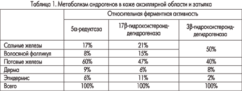 Большинство авторов (Mowszowicz I. et al., 1983; George F. et al., 1991; Normington K. и Russell D. W., 1992; Andersson S. et al., 1993; Beckmann M. W. et al., 1993; Wilson J. D. et al., 1993; Russell D. W. et al., 1994) связывают активность андрогенов в отношении потовых и сальных желез с присутствием 5α-редуктазы, являющейся микросомальным НАДФ-H-зависимым ферментом. Андрогенные рецепторы на коже в большинстве своем локализуются в дермальном сосочке и эпителии сальной железы (Choudhry R. et al., 1992; Blauer M. et al., 1991; Liang T. et al., 1993; Randall V. A. et al., 1993; Itami S. et al., 1991).